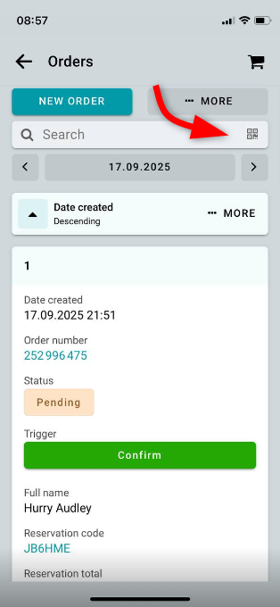 Para escanear el código, instala la app móvil Bukza para Android o iOS. Abre la app e inicia sesión en tu cuenta. Ve a la tabla de pedidos y toca el botón para escanear QR: