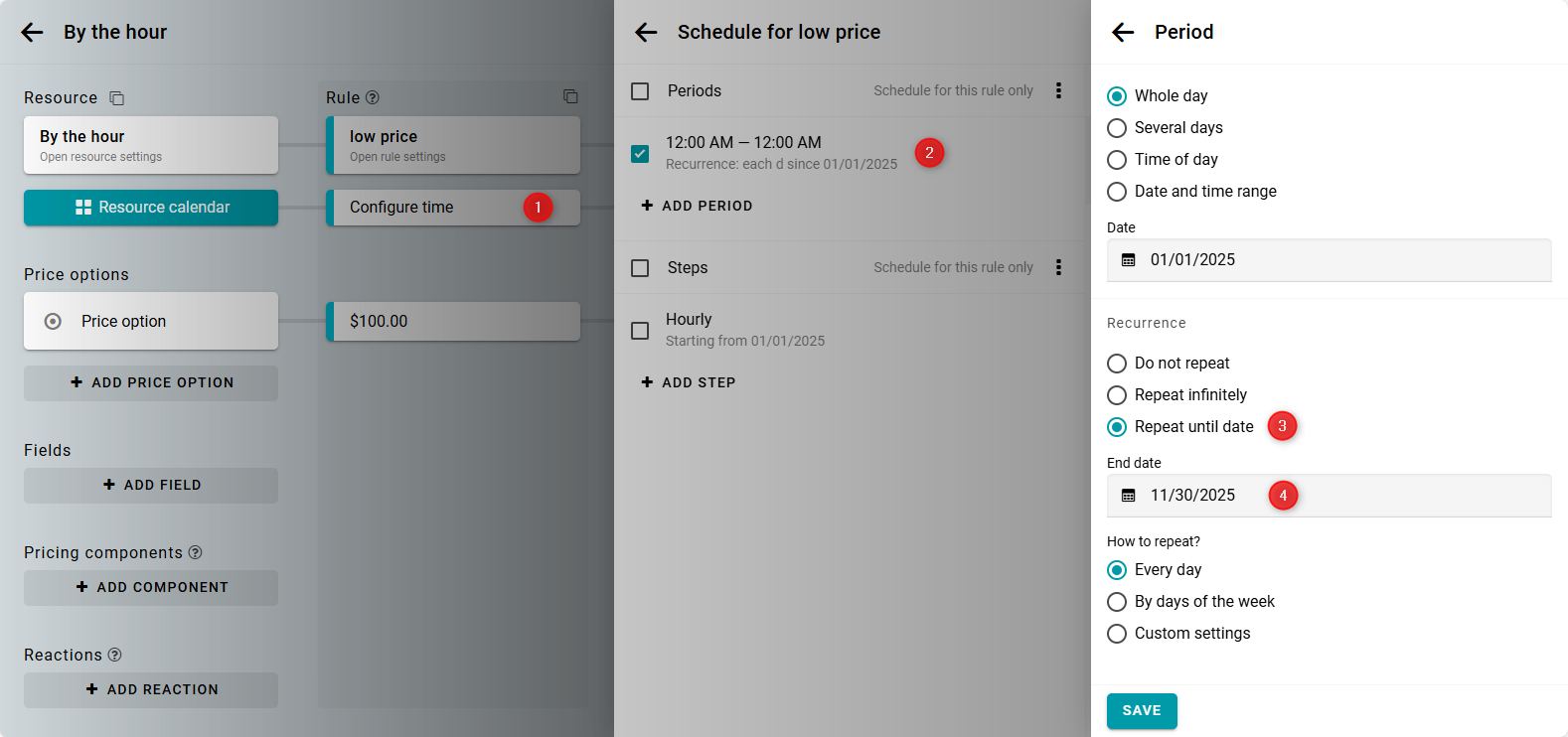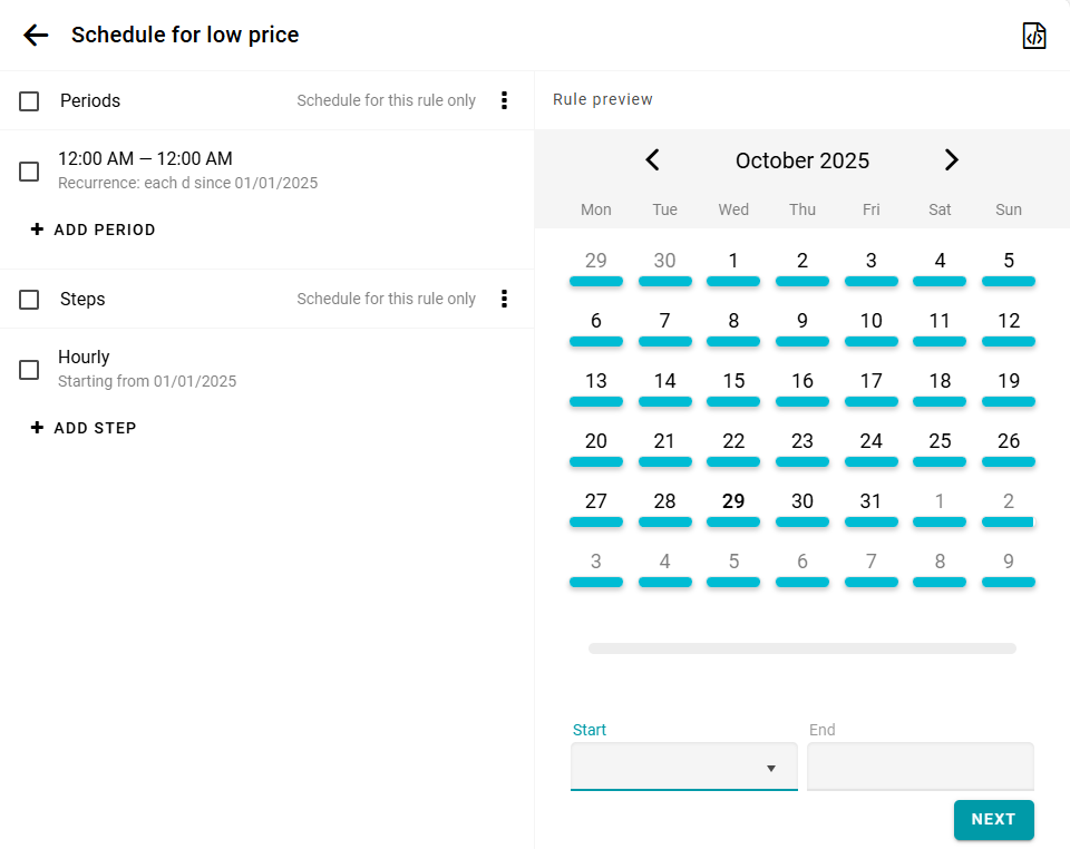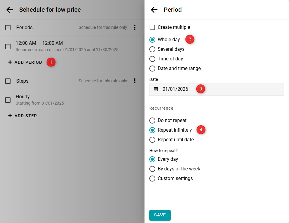 Luego, crea un nuevo período que comience el 1 de enero con la misma repetición diaria. Como resultado, tendrás los siguientes períodos: