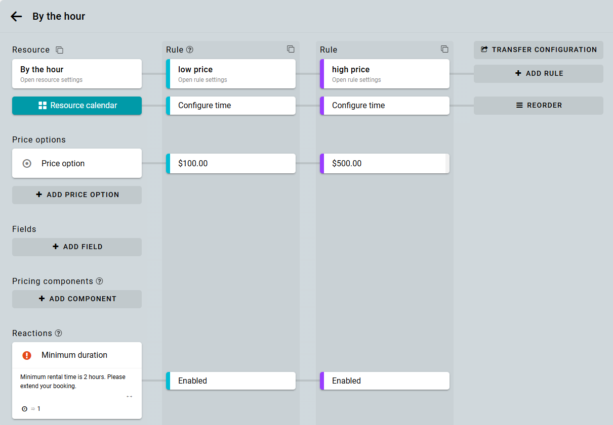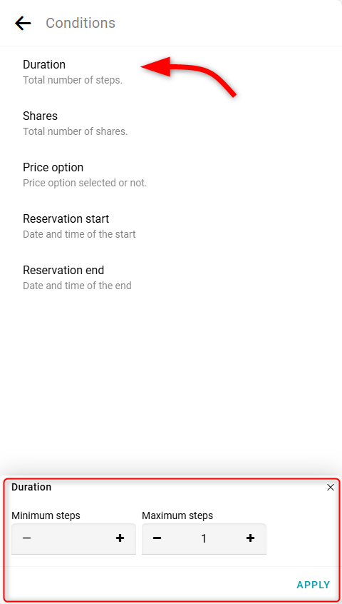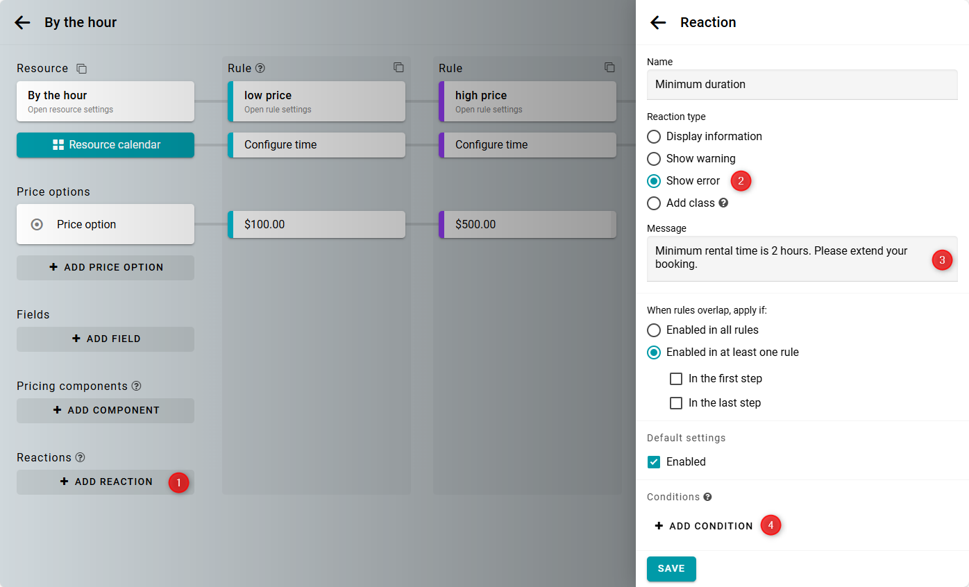 Elige la condición Duración. Especifica el número de pasos para que el mensaje aparezca cuando una reserva sea de 1 hora o menos. Aplica la condición y guarda la reacción.