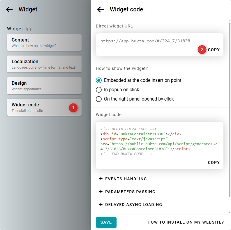 Para obtener el enlace para Instagram, abre la página de configuración del widget y ve a la pestaña Código. Haz clic en Copiar.